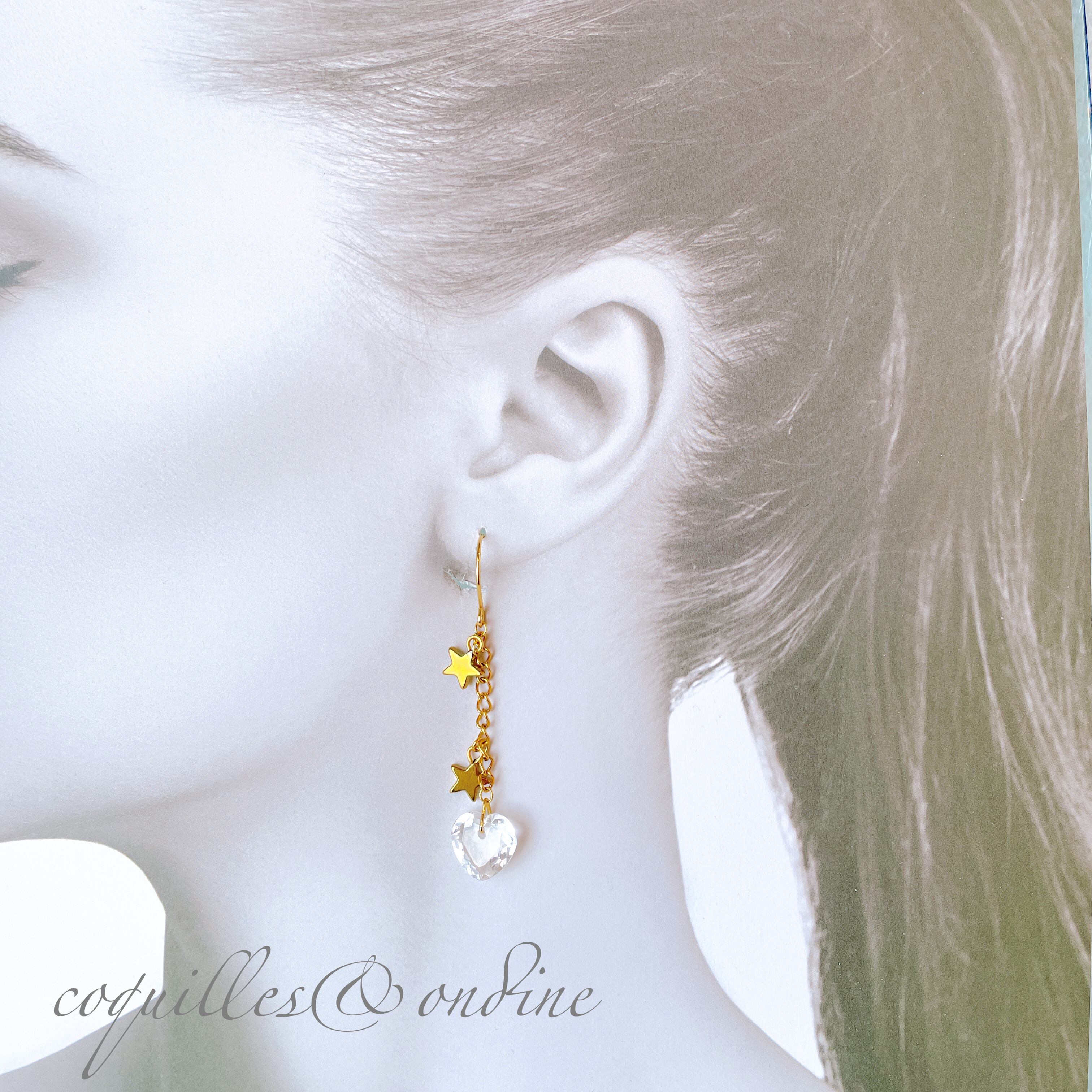 クリスタルハートと星のロングチェーンピアス(金属アレルギー対応・サージカルステンレス)