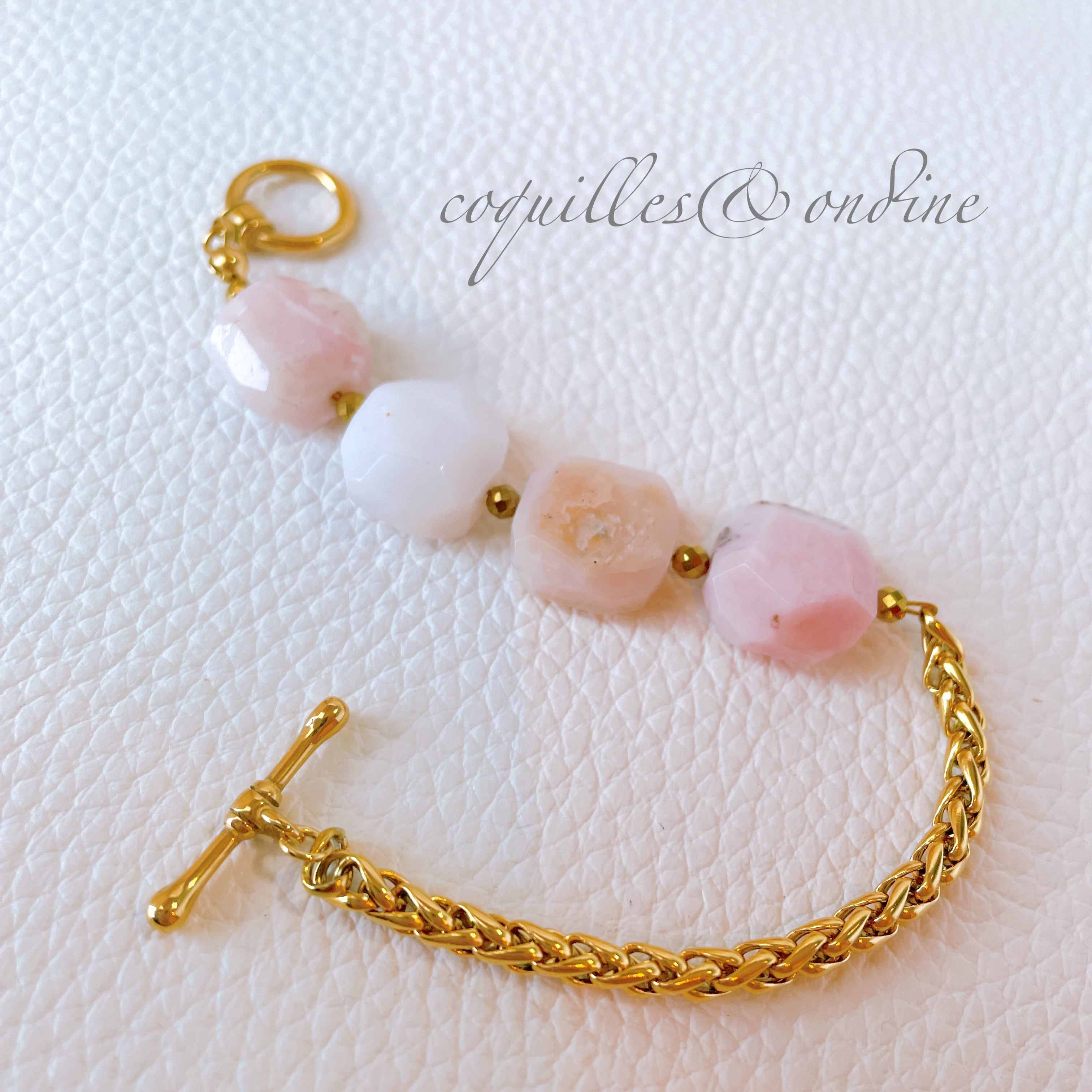 原石を活かした可愛いカラーピンクオパール、ゴールドコーティングヘマタイトを使用したブレスレットです。